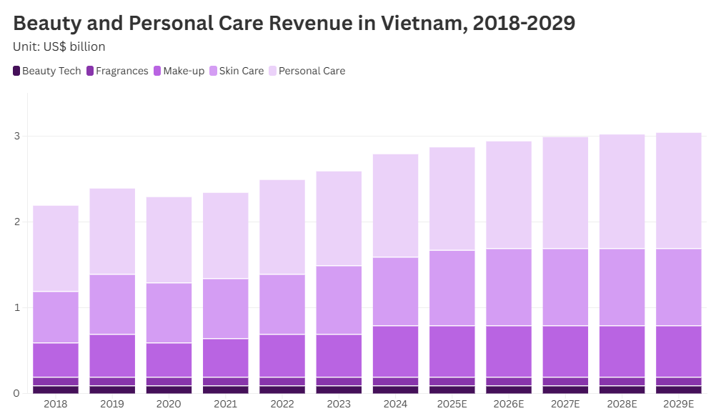Theo Vietnam Briefing, thị trường làm đẹp tại Việt Nam đạt tốc độ tăng trưởng kép hàng năm (CAGR) dự kiến là 3,26% từ năm 2025 đến năm 2029, dự đoán động lực chính đến từ tầng lớp trung lưu và nhu cầu làm đẹp gia tăng. Trong báo cáo tổng hợp của The Investor, thị trường làm đẹp & chăm sóc cá nhân đã đạt khoảng 74.4 nghìn tỷ đồng trong năm 2025, tăng gần 30% YoY - một mức tăng trưởng rất cao trong bối cảnh cạnh tranh ngày càng gay gắt.